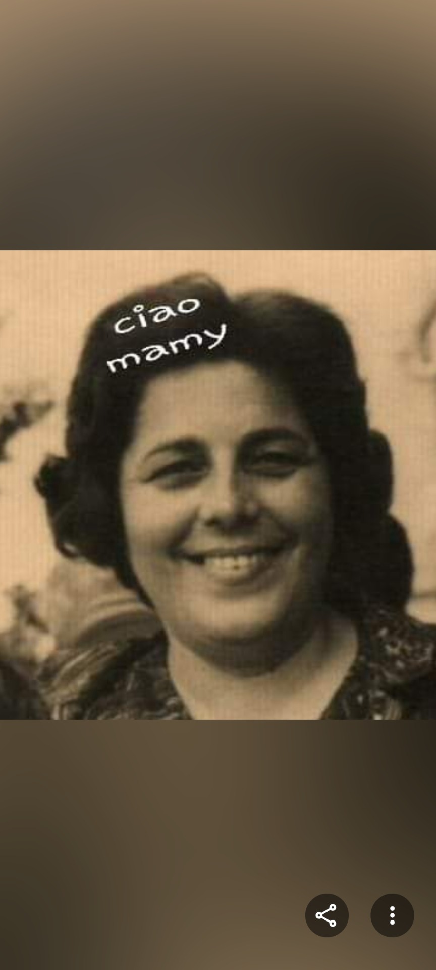 Mi hai aspettato. Quella notte non avevo dormito con te.Tony si illudeva di poterti portare a casa ed è andato via convinto di farlo presto. Ti ho messo sul petto i tuoi santini consunti dalle preghiere serali e improvvisa ti ho sentita uscire dal tuo corpo, venire verso di me e poi salire sempre più in alto e ti ho detto: Non voltarti indietro Mamy ! Vola verso la luce perché le tue preghiere, il tuo amore per noi è stato immenso . Hai dedicato la tua vita alla famiglia e pregato per tutti, aiutato tutti... parenti e amici. Sempre pronta a donare te stessa. Grazie per i tuoi insegnamenti di amore